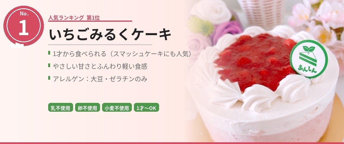 小さなお子さまにも大人気! 【乳・卵・小麦不使用】やさしい いちごみるくケーキ 「アレルギーがあっても、安心してケーキが食べられる幸せを。」 やさしい甘さとふんわり軽い口あたりのいちごムースケーキ。 豆乳ベースのクリームと、きび砂糖のやさしい甘みで仕上げました。 お誕生日や記念日、がんばったごほうびにも。 冷凍で全国配送OKです! ⸻ ケーキの特徴 ・乳・卵・小麦不使用(アレルギー対応) ・小さなお子さまから大人まで人気No.1! ・いちごのほのかな酸味+甘さ控えめで食べやすい ・ふんわりと優しい食感 ・甘ったるいケーキが苦手な方にもおすすめ! ⸻ こんな方におすすめ! ・乳・卵・小麦アレルギーのある方 ・グルテンフリーを心がけている方 ・健康志向の方 ・お子さまの初めてのケーキにぴったり ・甘すぎないケーキを探している方 ⸻ 原材料(アレルギー28品目のうち含む:大豆・ゼラチン) 豆乳ホイップ(植物性)、いちご、きび砂糖、豆乳、米粉、ココナッツミルク、コーンスターチ、上白糖、米油、水あめ、レモン汁、ゼラチン、葛粉/膨張剤、乳化剤、安定剤(増粘多糖類)、メタリン酸Na、香料 ※使用する材料・器具はすべてアレルゲンと交差しないよう厳重に管理しています。 ⸻ 美味しいお召し上がり方 冷蔵庫で約8時間ゆっくり解凍していただくと、ふんわりなめらかな口どけに。 解凍後は賞費期限に関わらず、できるだけ早めにお召し上がりください。 ⸻ 発送について ・冷凍配送で全国にお届けします(発送日より冷凍で約1週間保存可能) ・お届け日時の指定が可能です。余裕を持ってご注文ください ・店舗受け取り希望の方は公式LINEよりご連絡をお願いいたします LINEはこちら https://line.me/R/ti/p/@809khhdx ⸻ 価格(税込) ・12cm:4,400円 ・15cm:5,300円 ・18cm:6,700円 ⸻ 【お客様の声】 Instagramでご紹介 アレルギーケーキあんしん のハイライトをチェック✨ https://www.instagram.com/allergy_cake_anshin?igsh=YzVhang3a2pvdmlj&utm_source=qr ご注文前に アレルギーの有無を備考欄にご記入いただけるとより安全にご対応できます。 ご不明点やご希望がある方は、InstagramのDMまたはLINEでお気軽にご相談ください ・配送日時指定は天候や交通事情により遅延の可能性がございます。余裕をもってご注文ください 不可抗力により万が一遅れてしまった場合は責任は負いかねますのでご了承の程よろしくお願いいたします。